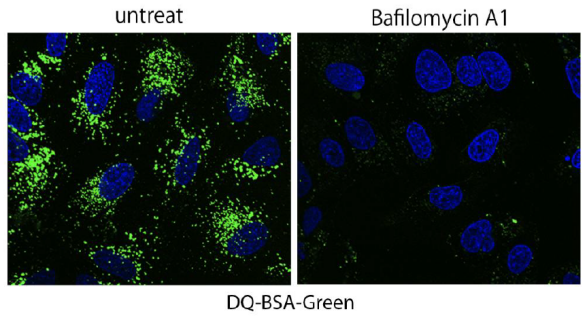 分子探针DQ-BSA-Green 是基于新西兰来源的牛血清白蛋白(BSA)的荧光溶酶体活性分子探针,BSA分子内用绿色荧光染料进行多位点高浓度标记,标记后的BSA分子由于高浓度的荧光探针分布,存在高度的荧光自抑制现象(self-quenching, DQ-BSA-Green 在功能正常的活性溶酶体中降解会产生BSA 蛋白质片段,这些片段具有孤立的荧光团,从而解除染料的自抑制效果,在细胞中发出明亮的荧光(下图untreat 组)。功能失活的溶酶体则无法降解BSA蛋白,从而具有更低的荧光信号,甚至荧光信号几乎完全消失(下图Bafilomycin A1 组)。