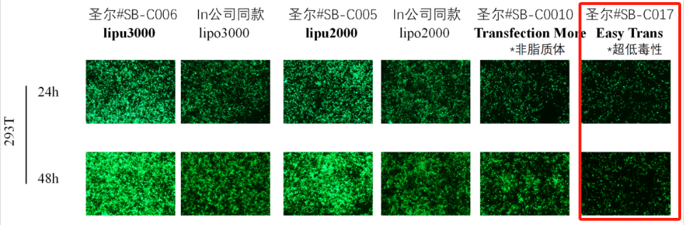 EasyTrans DNA transfection reagent 是新一代阳离子聚合物转染试剂。与传统基于脂质体的转染试剂相比,可以转染更多的DNA到细胞中。在DNA存在时EasyTrans可与其自行组装,形成稳定的复合物,透过细胞膜进入细胞内部,并保护DNA免受核酸酶的降解。该转染试剂具有极低的细胞毒性,不受培养基中血清和抗生素的影响。 EasyTrans 转染试剂对多数培养细胞都有较高的转染效率(不同种类的细胞转染效率有明显差异)。本产品推荐用于贴壁动物细胞中质粒等DNA的转染。转染试剂用量与DNA的量比3:1。