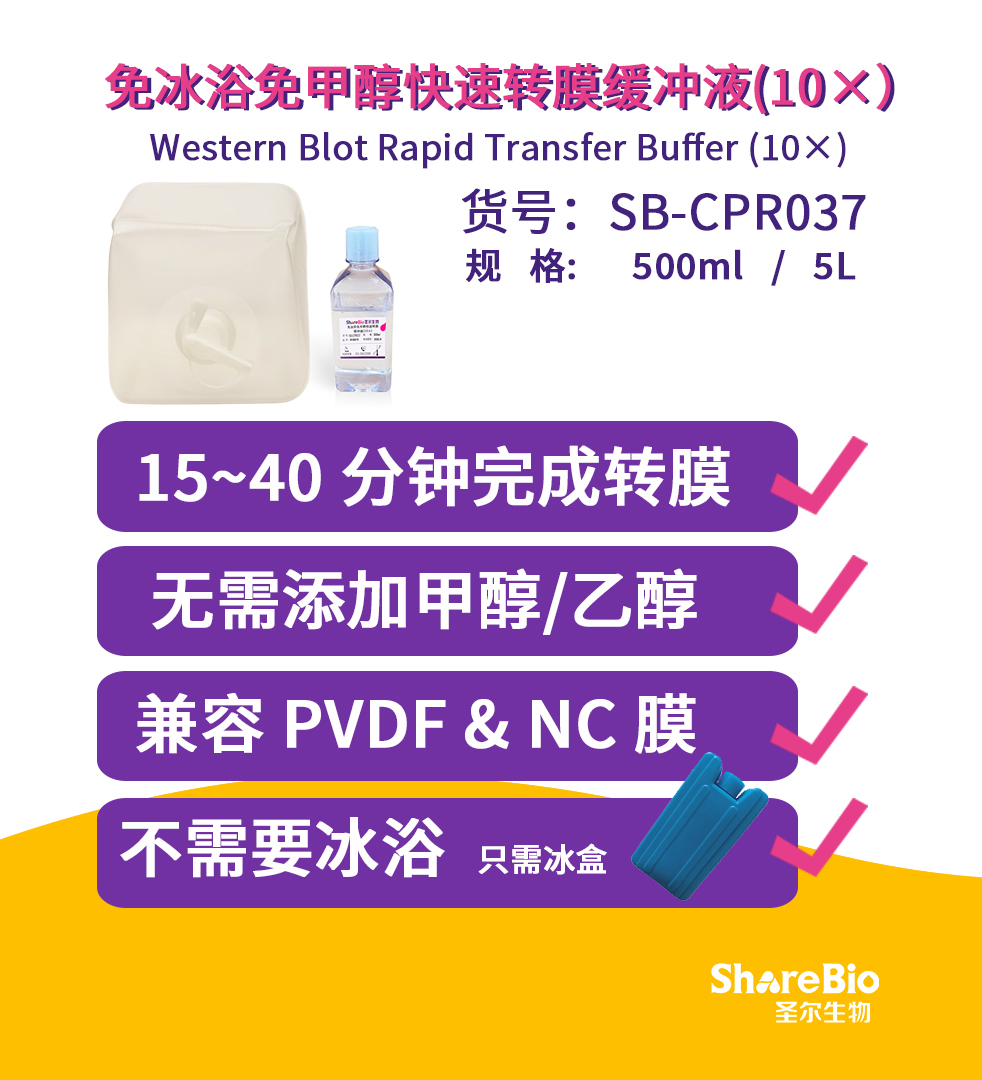 本产品采用全新的快速转印配方,15~40 分钟即可完成western blot 湿转法转膜,大大减少转膜时间。转膜产热小,无需冰浴。转膜液稀释后直接使用,配制过程中可以无需添加甲醇/乙醇,完全不影响转膜效果。