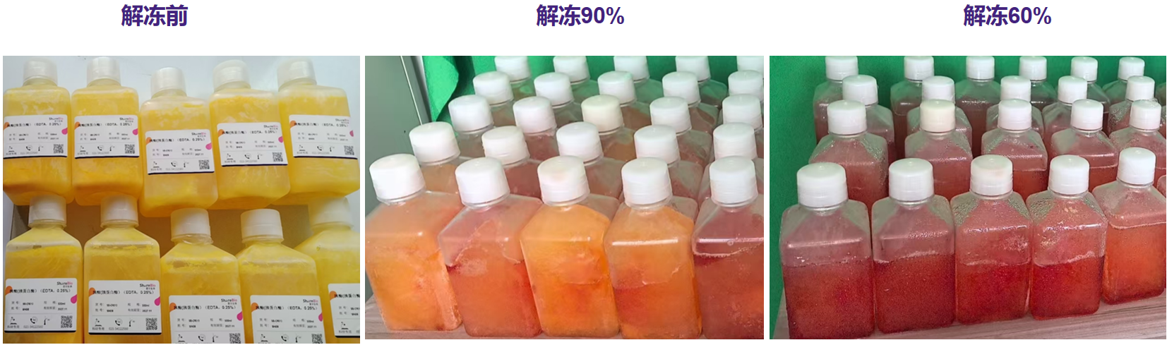 下图为我们同一批次的胰蛋白酶,缓冲体系随温度而变化,冻存状态是黄色的,溶解状态是红色。