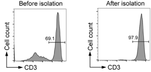 图1:使用人CD3+ T细胞磁珠法分选试剂盒分选人PBMC中的CD3+ T细胞,对分选后的目的细胞进行纯度分析。从人PBMC中分选CD3+ T细胞,分选前后的细胞用PE anti-human CD3抗体标记后进行流式细胞仪分析,分选前后的CD3+ T细胞纯度分别为69.1%和97.9%。