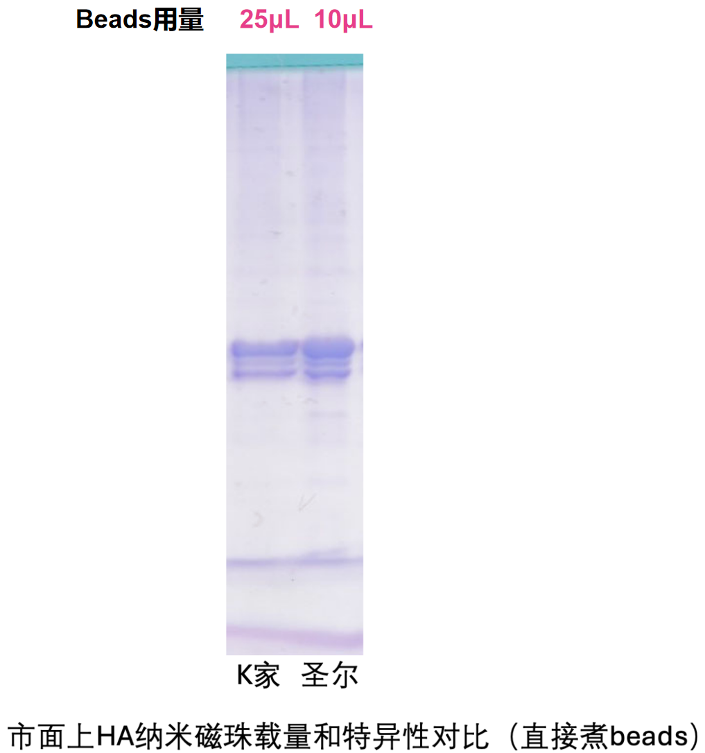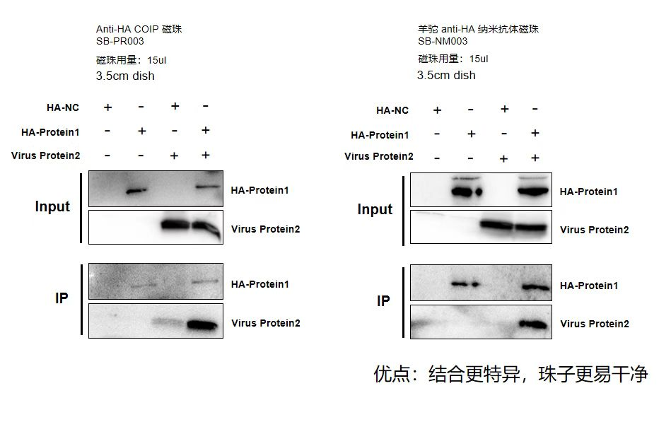 抗HA标签纳米抗体磁珠用于免疫沉淀HA标签(YPYDVPDYA)的融合蛋白,由识别HA标签的纳米抗体与磁珠共价结合组成。纳米抗体微珠用于免疫共沉淀实验,IP复合物无论采用非变性洗脱还是变性洗脱均不会出现抗体的轻、重链污染问题,且亲和力强,结合量高,特异性强,兼容性好,稳定性好。适用于哺乳动物、植物、细菌、酵母、昆虫等各种生物的细胞提取物。