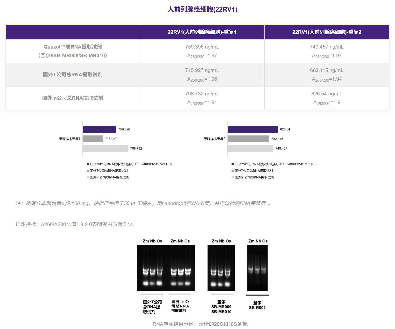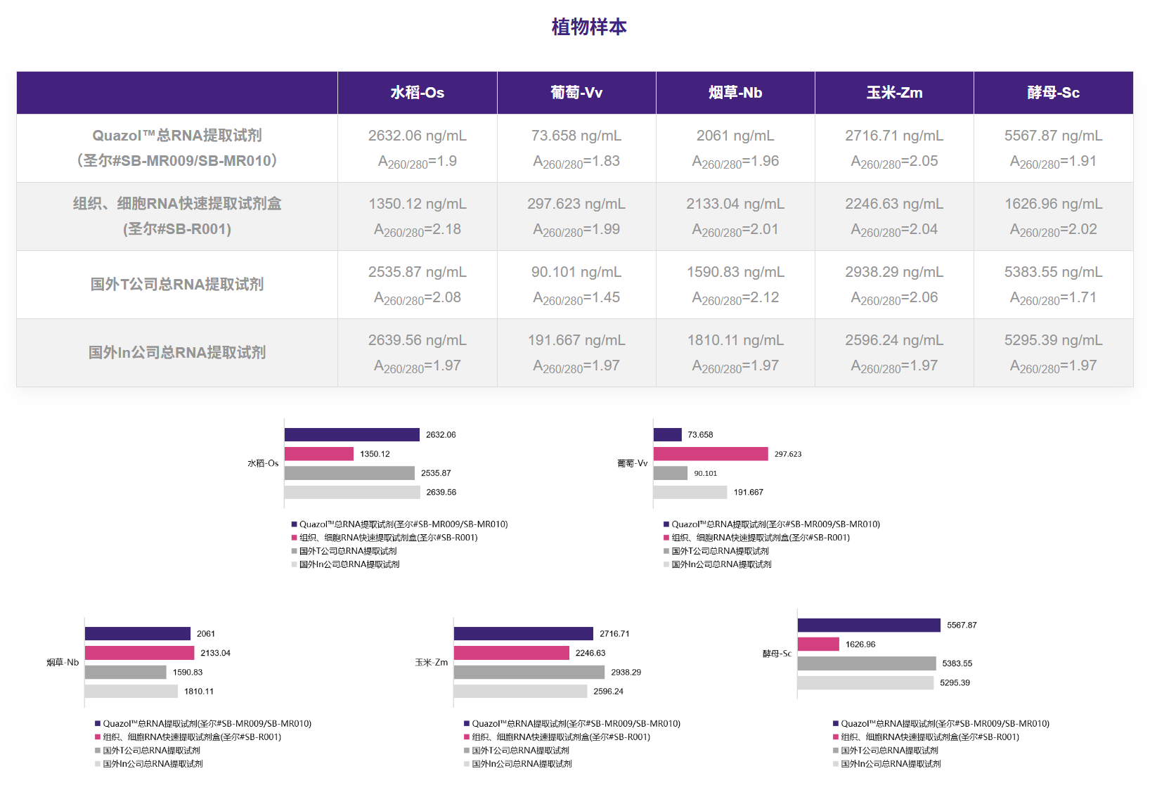 选用植物组织样本及动物细胞在相同条件下进行的RNA提取,经浓度检测及A260/A280检测,结果表明,圣尔三款产品与进口产品相比,提取RNA的效果相当(R001为柱式法,产量低于有机溶剂抽提法),且均适用于植物组织与动物细胞RNA提取。