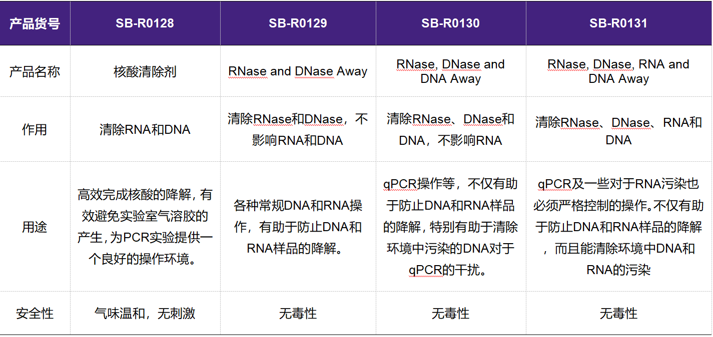 圣尔生物的核酸清除剂(SB-R0128)、RNase and DNase Away (SB-R0129)、RNase, DNase and DNA Away (SB-R0130)和RNase, DNase, RNA and DNA Away (SB-R0131)是固相表面清除试剂的系列产品。每种产品能够清除的核酸酶和核酸的范围有所不同,下表是这四种产品的主要特点和差异,请根据实验的实际需求参考下表进行比较和选择。