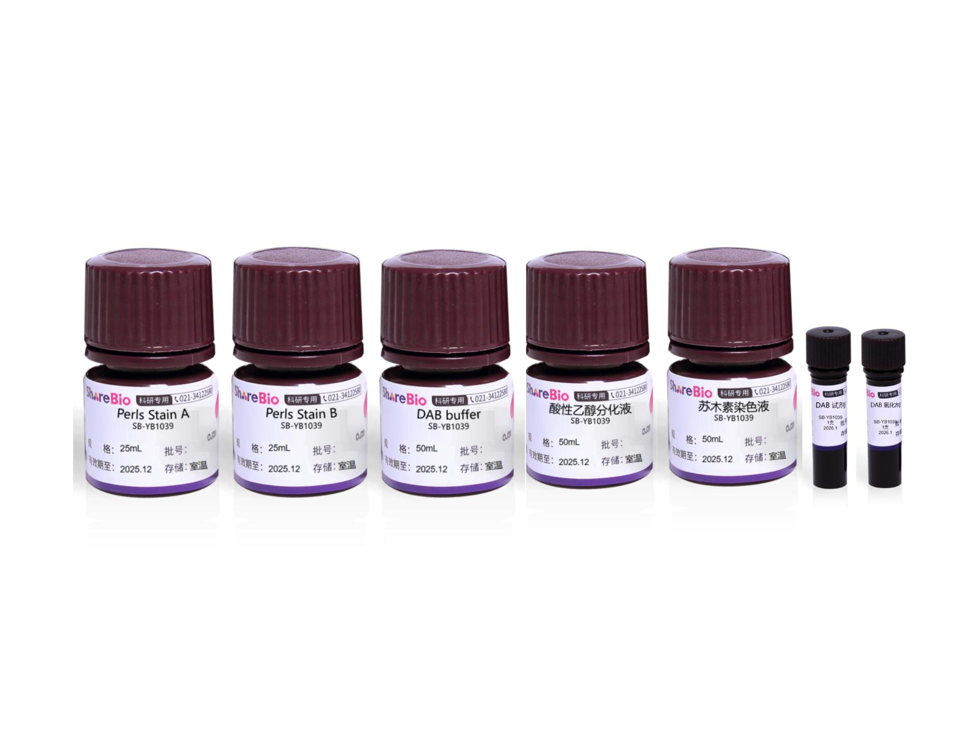 含铁血黄素(Hemosiderin)是一种血红蛋白源性色素,为金黄色或棕黄色颗粒,因其含铁,且为金黄色,故称为含铁血黄素。当红细胞被巨噬细胞吞噬后,在溶酶体酶的作用下,血红蛋白被分解为不含铁的橙色血质和含铁的含铁血黄素。含铁血黄素染色又称为Perls普鲁士蓝反应(Prussian blue reaction) ,用于显示局部组织内的各种出血性病变,常见于吞噬细胞内,可以很好地区分含铁血黄素与其他色素。 普鲁士蓝染色液(DAB增强法)其染色原理是组织中的三价铁离子从蛋白质中被稀盐酸分离出来,与亚铁氰化钾形成一种不溶解的蓝色的亚铁氰化铁沉淀而显示出组织中的高含量铁元素,当组织中的铁元素含量极少时,该染色不能显示出蓝色定位铁元素,加入DAB后,与亚铁氰化铁沉淀发生氧化还原反应形成棕色化合物,增强了检测的特异性,特别适用于组织铁含量较少的组织。